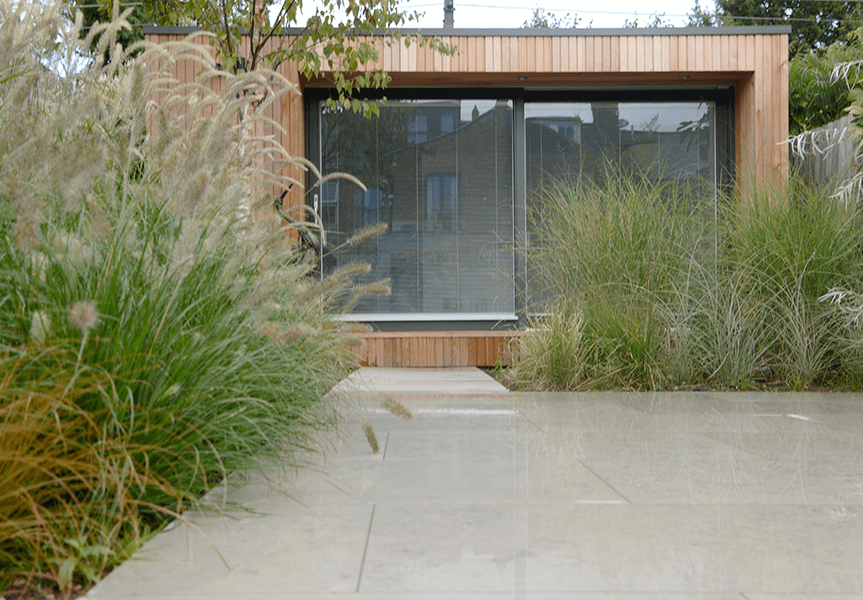 An outside studio was incorporated into the design of this long rectangular garden. The space was separated in to individual areas incorporating natural and structural planting, connected by Porcelain and Limestone paths.