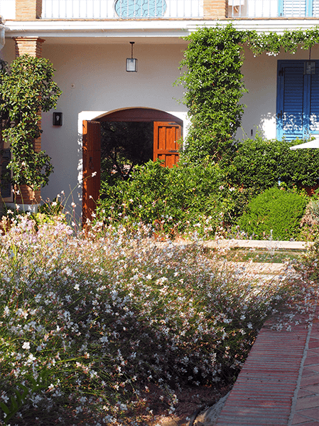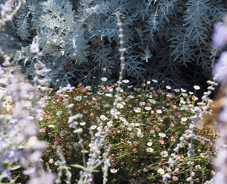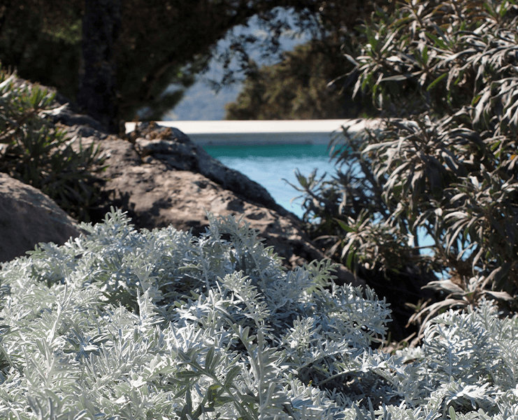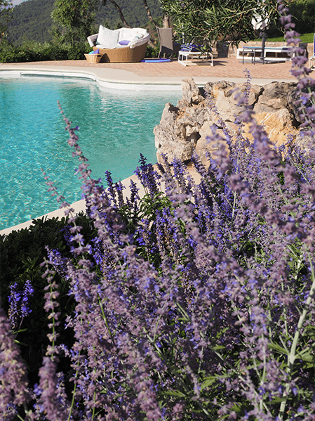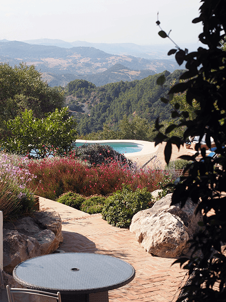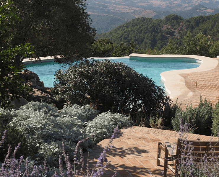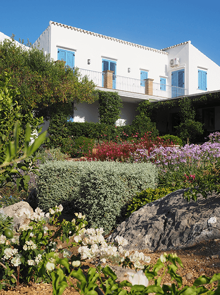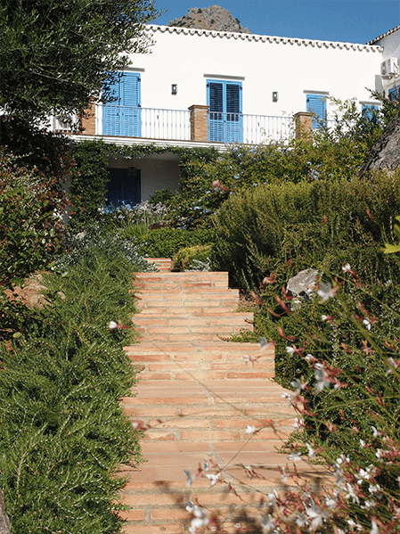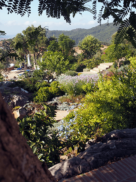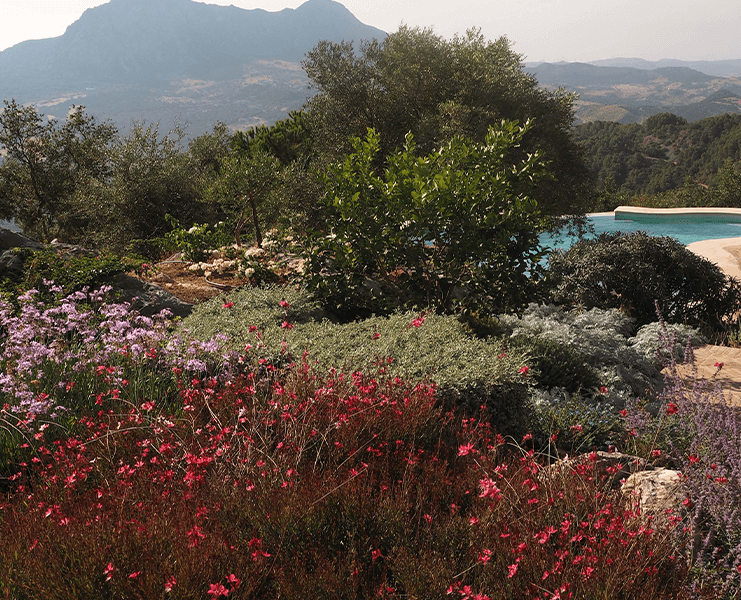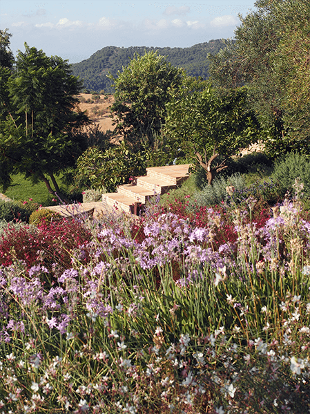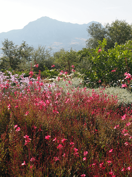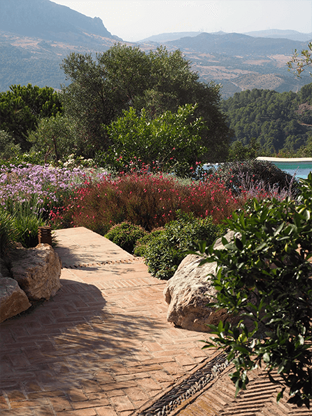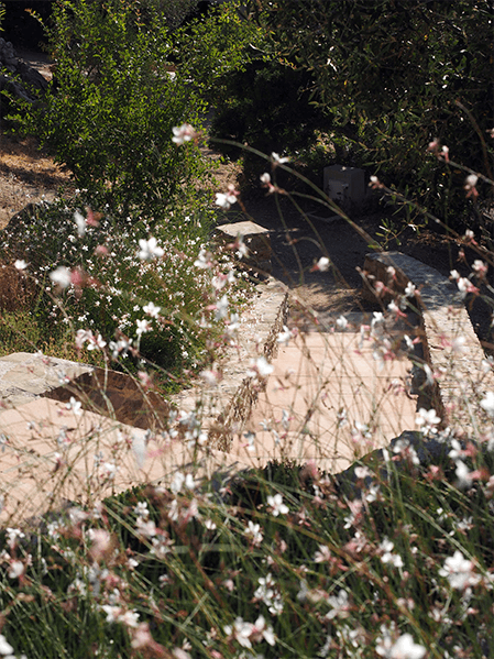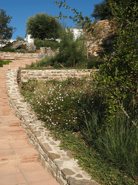 By creating gentle terraces and stairways we enabled the client to move around this hilltop garden. Drifts of natural planting softened the new structures and complement the dramatic backdrop.